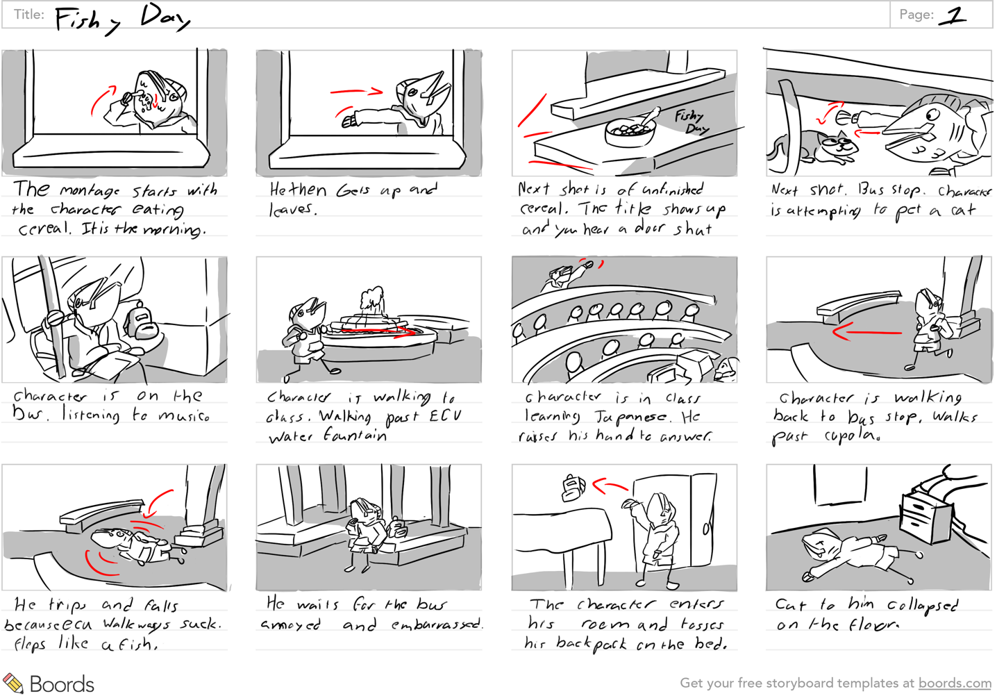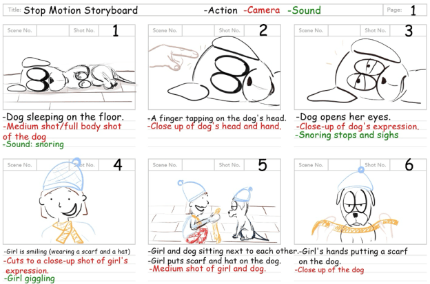 Storyboards are much like comic books. You show the ‘key’ frames of animation while the action between frames is completed in the viewer’s mind. You can write in sound effects or use arrows to add emphasis to or illustrate actions. You should also write in narration below each frame to explain what kind of action is taking place.
