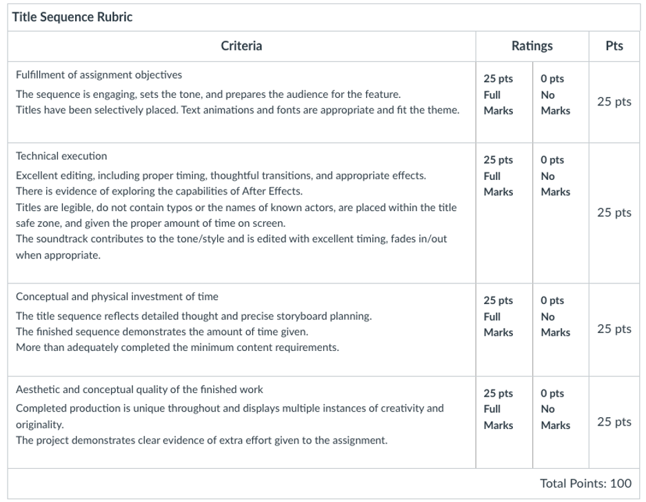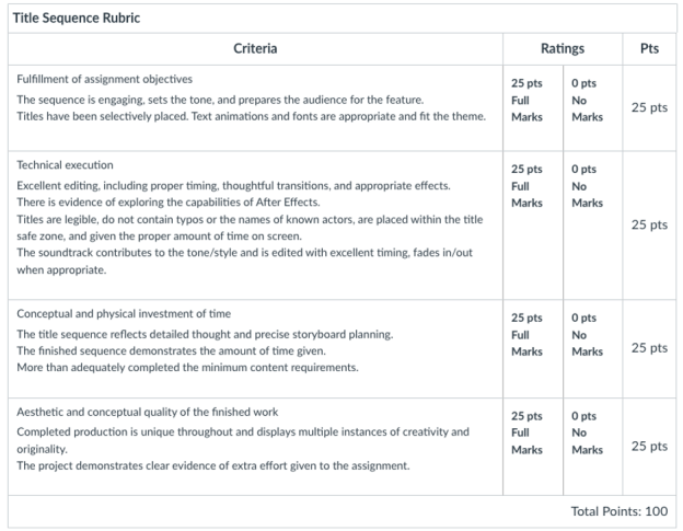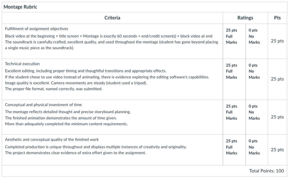 The course consists of four modules. The first three each require a project proposal, a storyboard, the final video, and critique participation. Students will create a Demo Reel in the fourth module and update their portfolio site. The fourth module counts as the course final