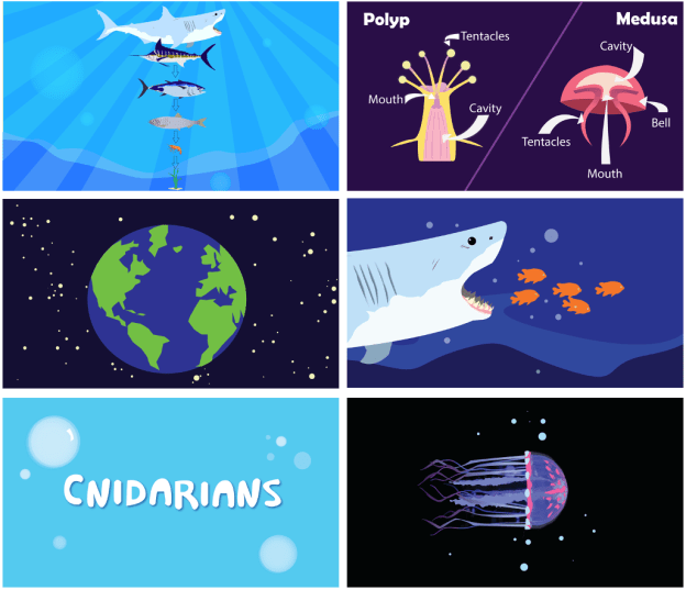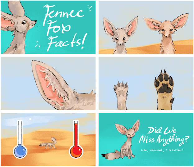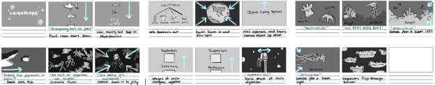 Storyboards are much like comic books. You show the ‘key’ frames of animation while the action between frames is completed in the viewer’s mind. You can write in sound effects or use arrows to add emphasis to or illustrate actions. You should also write in narration below each frame to explain what kind of action is taking place.