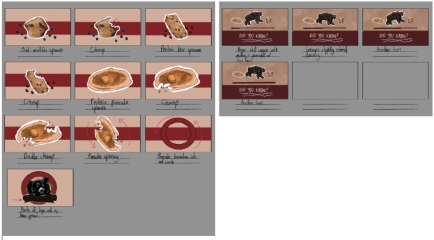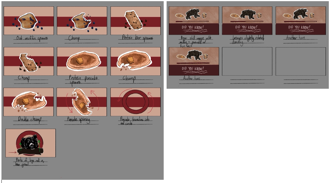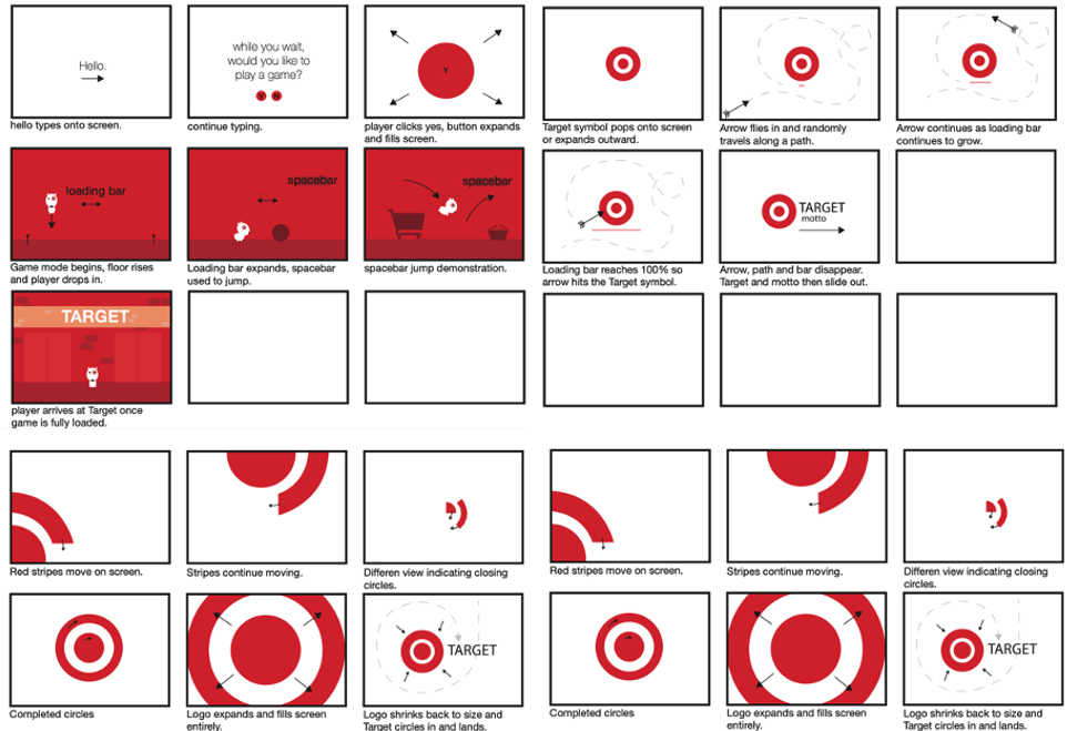 Start loose, preferably by sketching. But you can also use basic shapes and text in Photoshop and Illustrator. Don’t spend hours on each frame. The finalization will come later. Show ‘key’ frames, like a comic book. The action will be completed in the mind of the viewer.