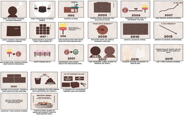 Final storyboards should be digital and in the correct aspect ratio. Final boards should be a graphic representation of how your video will unfold, shot by shot, consisting of several squares in the same aspect ratio as the intended video (generally, 16:9 aspect ratio, meaning the width of the frame is about 1.78 times that of the height of the frame). They should have illustrations representing each shot and notes about what’s going on in the scene.