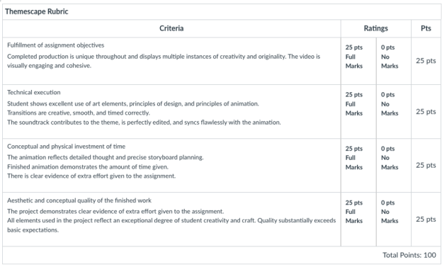 The course consists of four modules. The first three each require a project proposal, a storyboard, style frames, the final project video, and critique participation. In the fourth module, students will update their Demo Reel and their portfolio site. The fourth module counts as the course final
